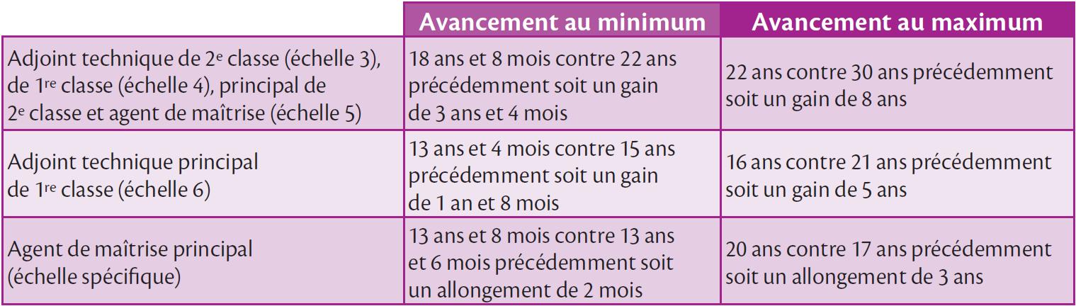Pour la plupart des grades, la progression de carrière est plus rapide que dans le dispositif précédant, sauf pour les agents de maîtrise principaux où la durée est quasiment identique pour l’avancement au minimum et un peu plus longue (trois ans) pour un avancement à la durée maximale.