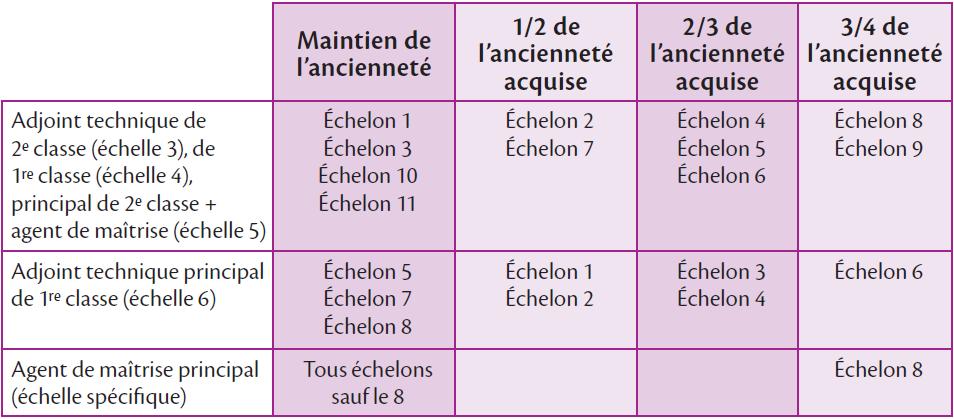 Une reprise différenciée de l’ancienneté - Dans certains cas de figure, l’ancienneté de l’agent dans l’échelon précédent est reprise dans le nouvel échelon. À l’inverse, parfois, l’ancienneté doit être recalculée.Un mécanisme similaire est appliqué pour déterminer l’ancienneté des agents de catégorie C intégrant la catégorie B.