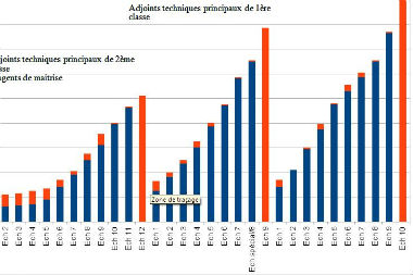 Ces données ne tiennent toutefois pas compte de la création d’échelons supplémentaires permettant de donner aux agents arrivant au terme de leur grade (au bout de l’échelle) une capacité à continuer à progresser. Ainsi, un 12e échelon a été créé pour les adjoints techniques de 1re classe (échelle 4), les adjoints techniques principaux de 2e classe et les agents de maîtrise (échelle 5).